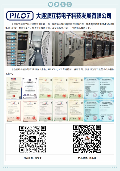 大連派立特電子科技發(fā)展有限公司,是一家面向全球的真空電源供應廠商,是集真空鍍膜電源/PVD鍍膜電源的研發(fā)、制作到量產,提供專業(yè)技術咨詢,及設備解決方案于一身的高新技術企業(yè)。 主要在售電源品類如下,已廣泛應用于諸多業(yè)內頭部企業(yè)并得到高度認可,支持按需定制: 多弧電源 燈絲電源 清洗電源 轟擊電源 靜電吸附電源 脈沖弧電源 中頻濺射電源 脈沖偏壓電源 離子源電源 直流磁控濺射電源 直流脈沖濺射電源 and so on... 目前已取得的認證有:高新技術企業(yè),ISO9001,CE,專精特新,發(fā)明專利、實用新型專利及美術、軟件著作權若干。